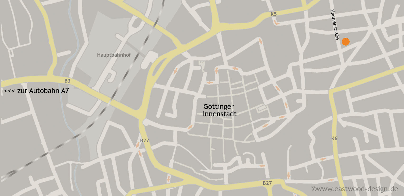 Vom Bahnhof Göttingen aus sind es ca. 25 Minuten zu Fuß. Gehen Sie über die Berliner Straße Richtung Innenstadt immer geradeaus: Durch die Goetheallee in die Prinzenstraße, durch die Fußgängerzone an der Skulptur am „Nabel“ vorbei in die Theaterstraße. Gehen Sie am Theater vorbei, überqueren Sie die Bühlstraße, und gehen Sie die Planckstraße hoch. An der Kreuzung zur Hanssenstraße steht das Eckhaus.